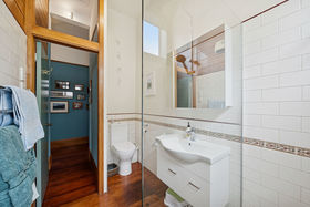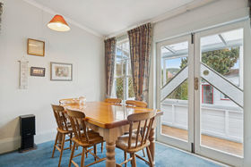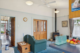 Rich Matai timber flooring and ornate timber doors complement a custom made timber kitchen, while the open plan layout flows effortlessly to a sun soaked deck.